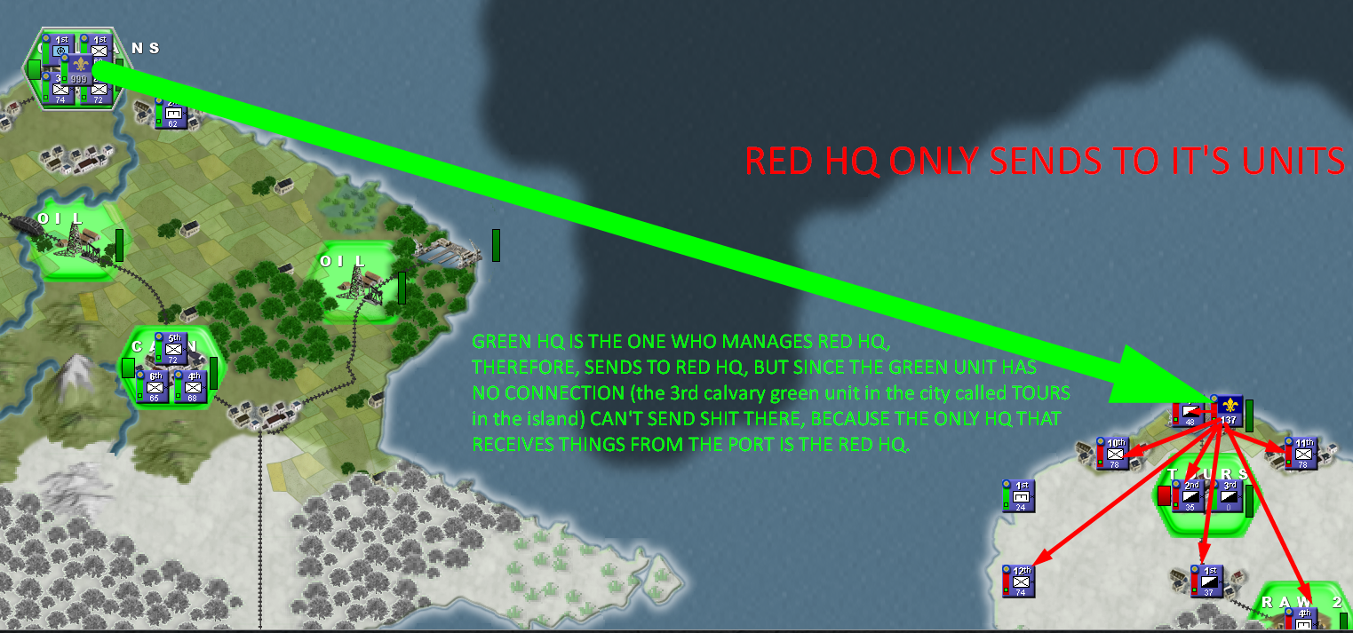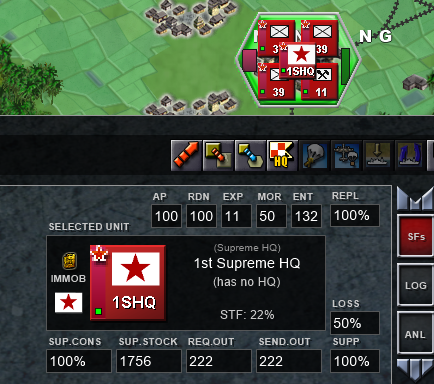 Ok, I finished building the road with the two engineers in this part, so now all my logistics is unified, I sent the yellow engineer to the frontlines and I am going to send this one to a RAW resource in the rear so it can build points until i can upgrade, I am going to use the strategic transfer. But notice a thing, the cost depends on which HQ you're using for the transfer. For example in this case: