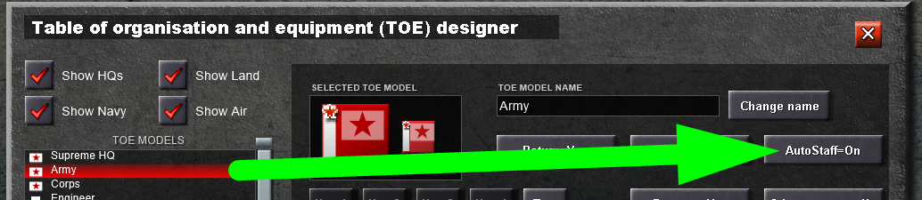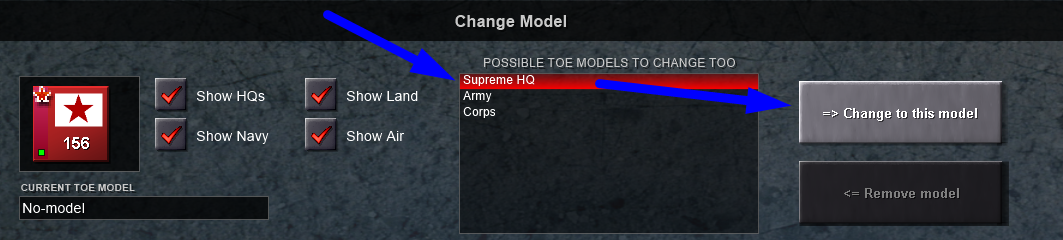 Click that button to select the model changer. Then, because this is an HQ, there's only the HQ options, I will change the Supreme HQ to a SHQ and the other HQ to a "Army HQ"