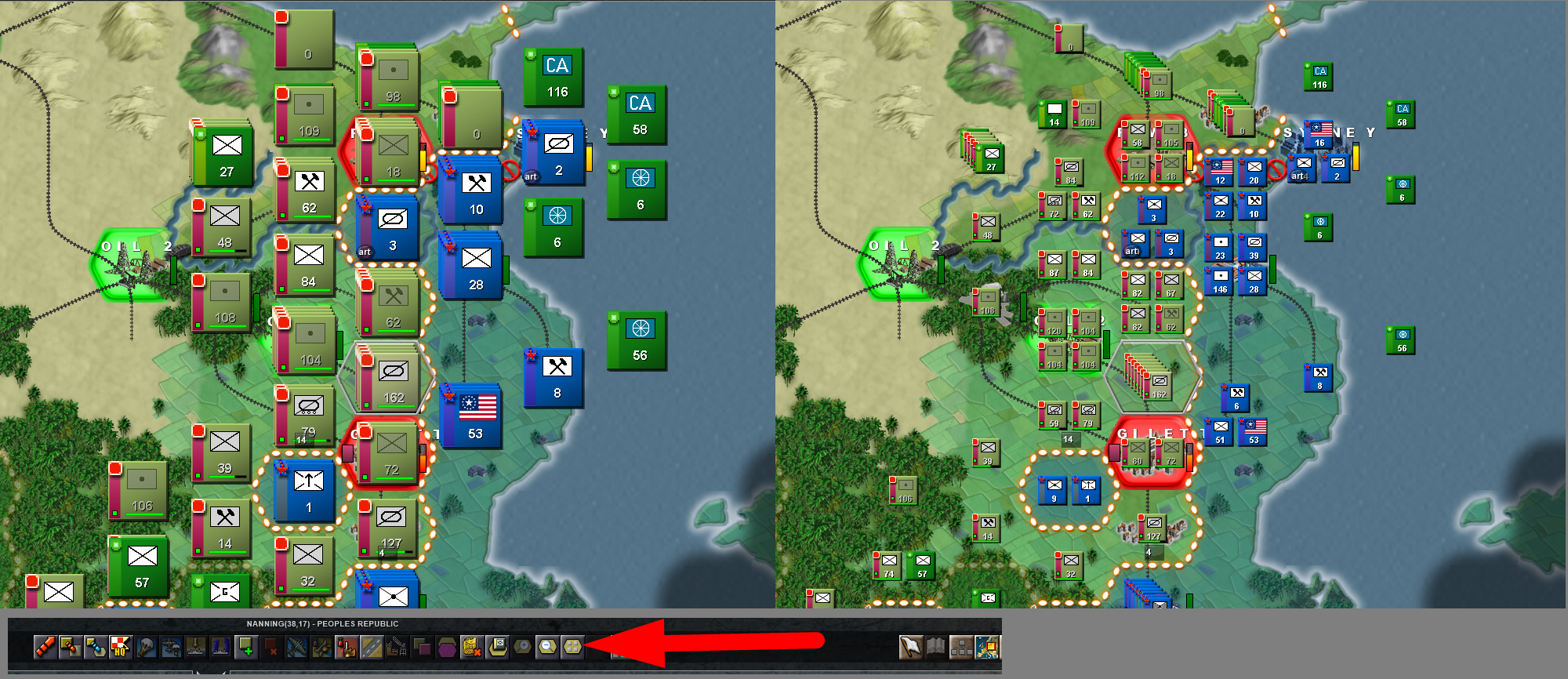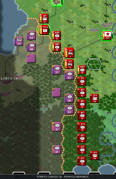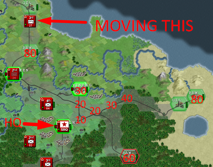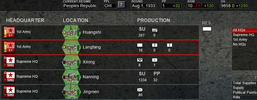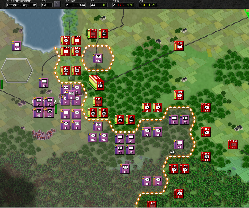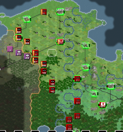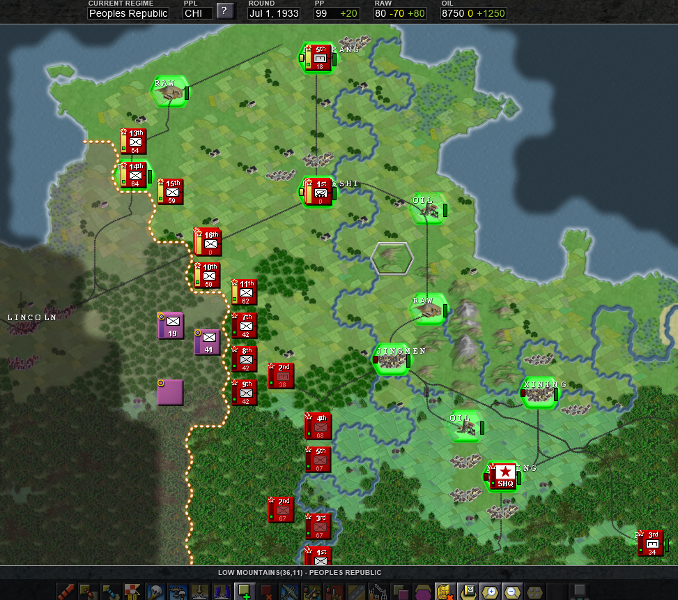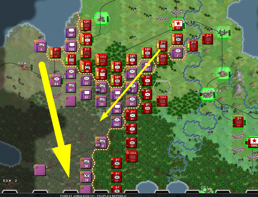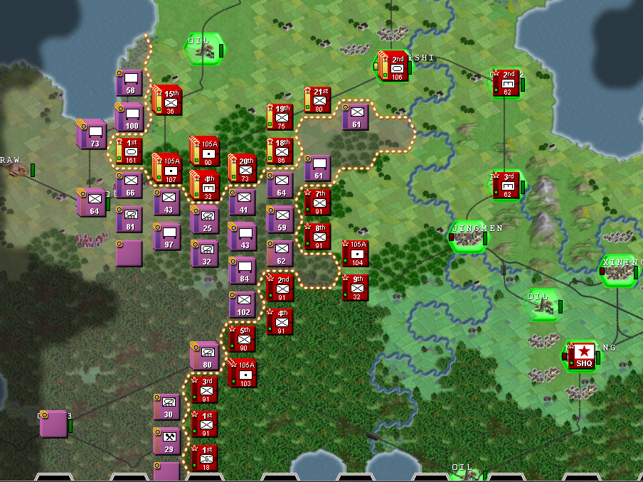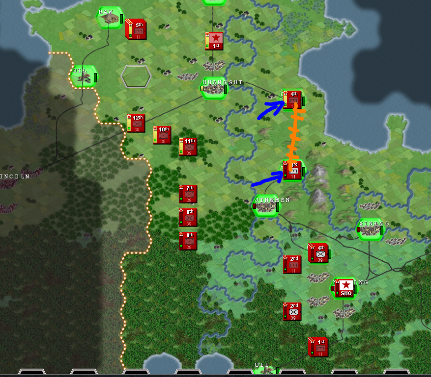 Is obvious that the north will be the zone of more intense warfare, so I'll set up all the north to the most elite units, under the 1st Army that will be established in the city of Huangshi, and from here, we will create a defensive line, taking priority the oil that we have just near the enemy frontier, because that's a easy target due to it's proximity, and can be subject of enemy artillery bombardment, OIL IS VITAL to our mechanized spearhead, so we have to protect that hex. In the first few turns is essential to our war effort to connect our logistics building a road between all our cities. Then, we have to build that defensive line to hold the first enemy waves, and after the enemy has been weakened... we counter attack with our mechanized forces, with the hope of destroying most part of the enemy army in a big encirclement in the north sector, if that objective is achieved, we could easily be on the offensive until the enemy frontline stabilizes later on, or until our supply lines start getting bad.