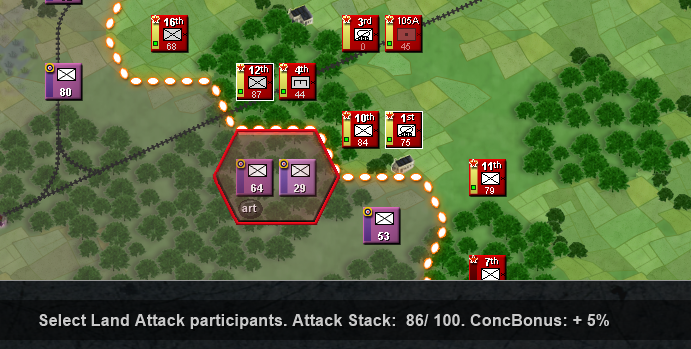 For attacking is the same as the artillery, but with the attack button. The STACK number matters more now, because you can get debuffs if you surpass it. The more hexes you attack from, the more points you will have for attacking. Since I am attacking from 2 hexes, I get this +5% bonus only. I think you need at least 3 hexes for 150 max stack points.