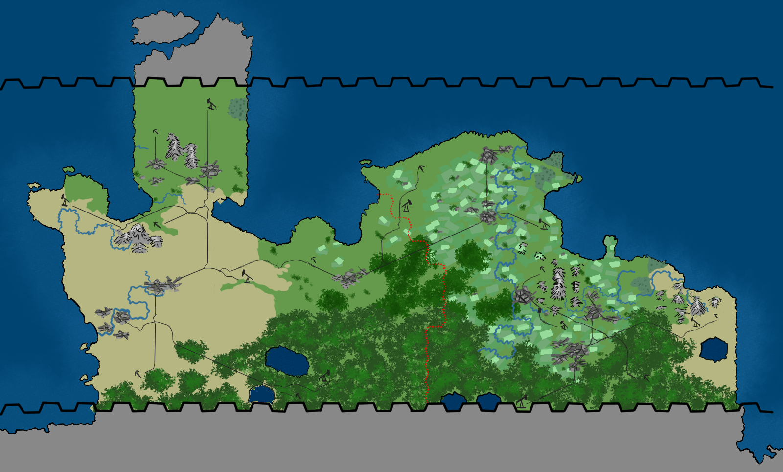 At the north there is a small gap with plains that go direct to the enemy city, in the middle there is a forest, with the main enemy road, and all the south is covered up by jungle....