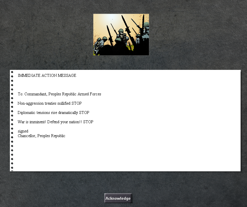 As you can see, the enemy has not yet covered their front. So I think I should start the war right now before they get stronger.... We do all that kind of things on the diplomatic menu.