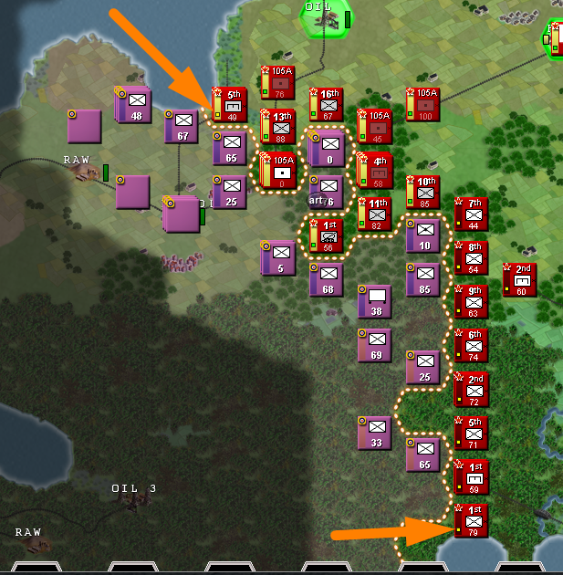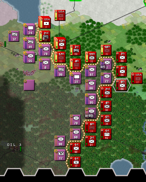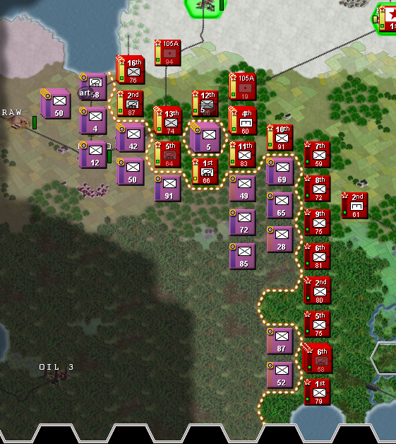 At this point... Even if we are doing good holding the front, we are reached our limit and our oil reserves are 0. And or raw is also 0. This is going to make things slower.... Also that enemy unit on our rear makes shit very complex because we lack enough units to cover everything. Maybe we need to increase our infantry.... Betting everything on our panzer division to manage to push until the enemy city so we can increase our oil reserves.....