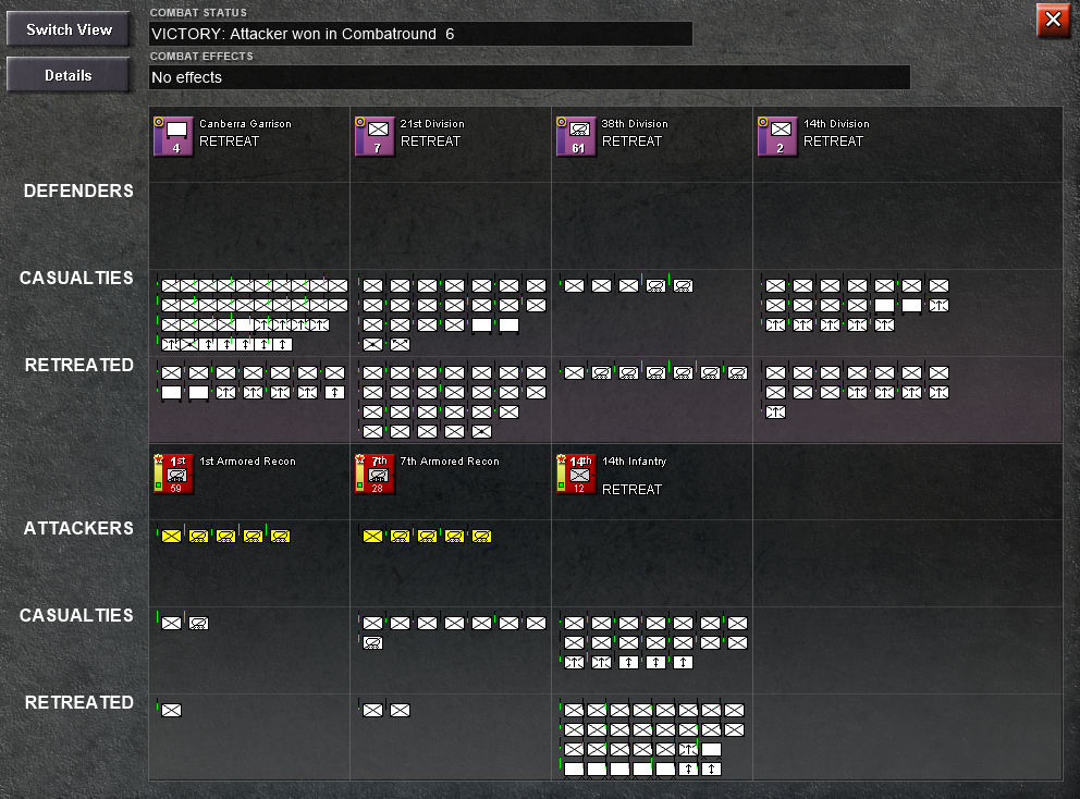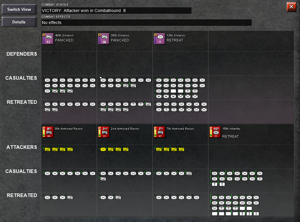 Indeed, the enemy managed to break the front, but this actually helped. Because in this turn, they had to move some of their units to the new hex, making their defense weaker, and I built 2 new armored recon units I used to make a attack and closed the pocket again. It was a basically suicide attack, I had to set up the units to 100% losses. And I almost lose, the 14th infantry brigade was basically aniquilated, but was a worth sacrifice.