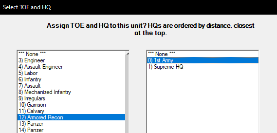 We are making a formation, then the game ask for which TOE and which HQ. Try to not missclick.