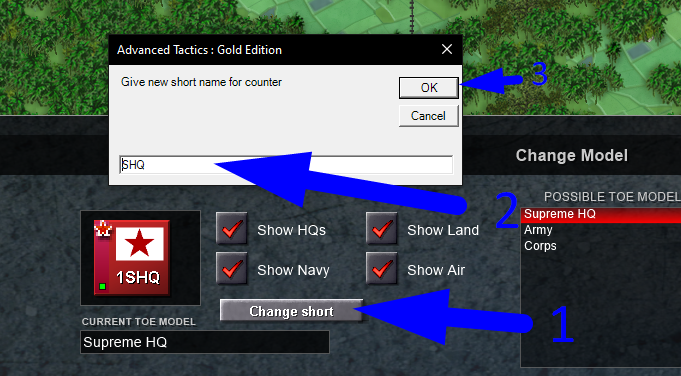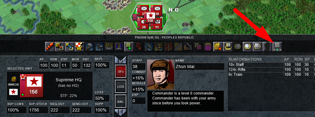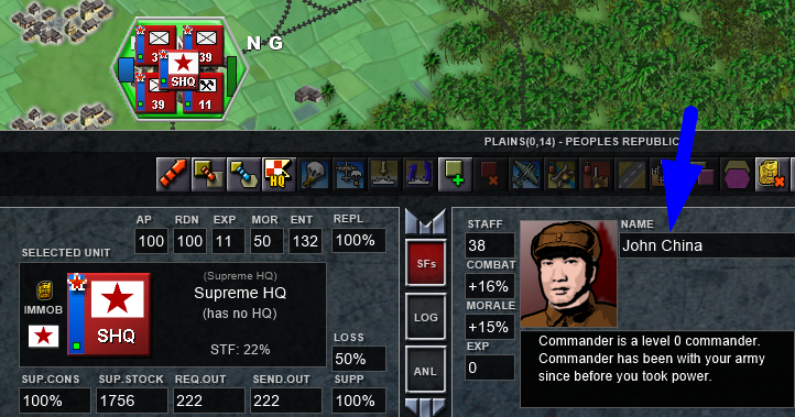 NOW IS DONE. Remember that is optional for you to do all this shit for asigning a Supreme HQ, but this serves as a tutorial on how to rename the counters, also we assing the TOE to the SHQ because the autostaff option which is helpful. Also remember that you can rename officers too, like this one who is now named John China.