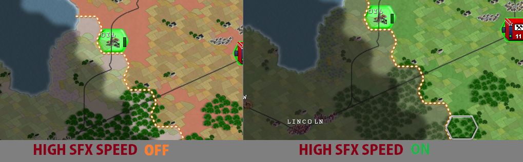 The Hex Colouring makes a nation territory have a overlay with its color, useful to differentiate which player/nation is each one, because otherwise, can get very confusing, is similar to the map of any strategy game, like hoi4 for example, and High GFX Speed, makes the game use your GPU, because this is a very old game, and without that option the map scrolls very slow, unresponsive and laggy, also the colouring gets very bad because without that option there's not transparencies.