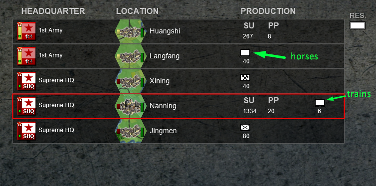 Basically what I am producing is engineers and rifles for replenishing the current units deployed, horses for mobility of said units, trains for more logistics to deliver all these production, PP (political points) to save a bit for building shit and buying research in the next turns.
